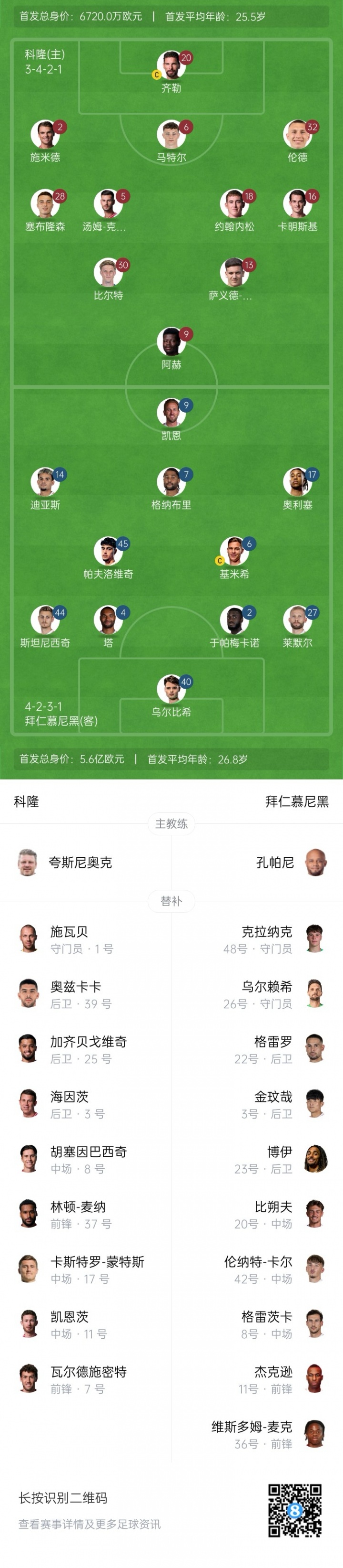 In the 9th round of the Bundesliga, Bayern played away to Cologne. The starting lineups of both sides were announced before the game.