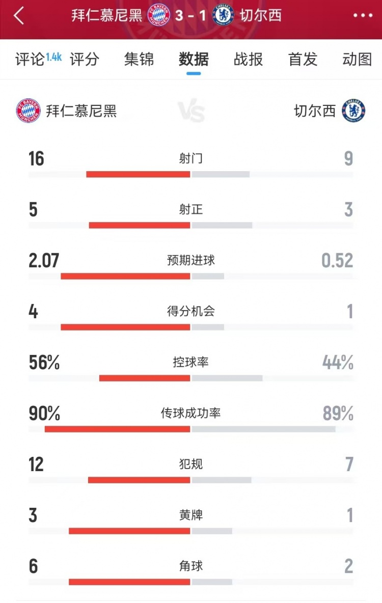 Bayern vs. Chelsea data: 16-9 shot, 4-1 scoring opportunity, expected goal 2.07-0.52