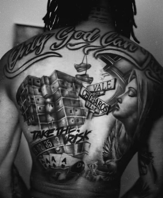 Body: Leo spent several months completing the large tattoos on his back, including the statue of the Virgin Mary and the neighborhood where he grew up