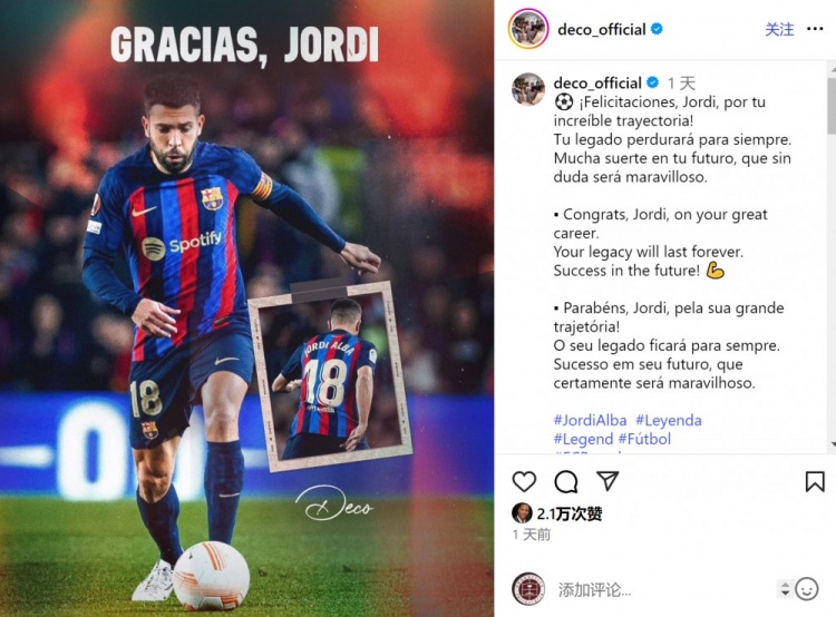 Deco social media posted a poster thanking Alba, with the text: "Congratulations, Jordi, you have had a wonderful career. Your 'football legacy' will last forever, and I wish you success in the future!"