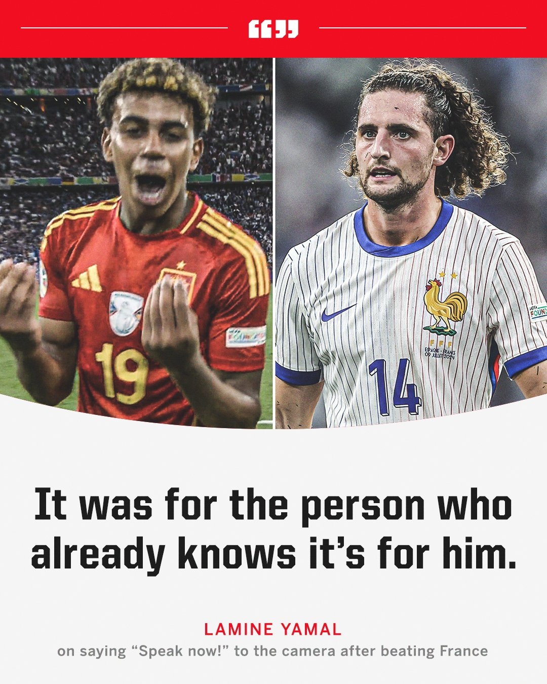 At the post-match press conference, Yamal also responded to French midfielder Rabiot's evaluation of him before the game. When asked about his speech to the camera after the game, Yamal said: "My celebration? This is for the person who knows it is for him."