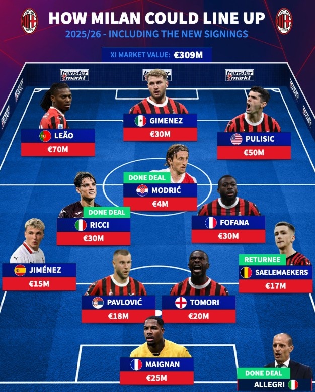 Forwards: Leo (70 million euros), Santiago Jimenez (30 million euros), Pulisic (50 million euros)