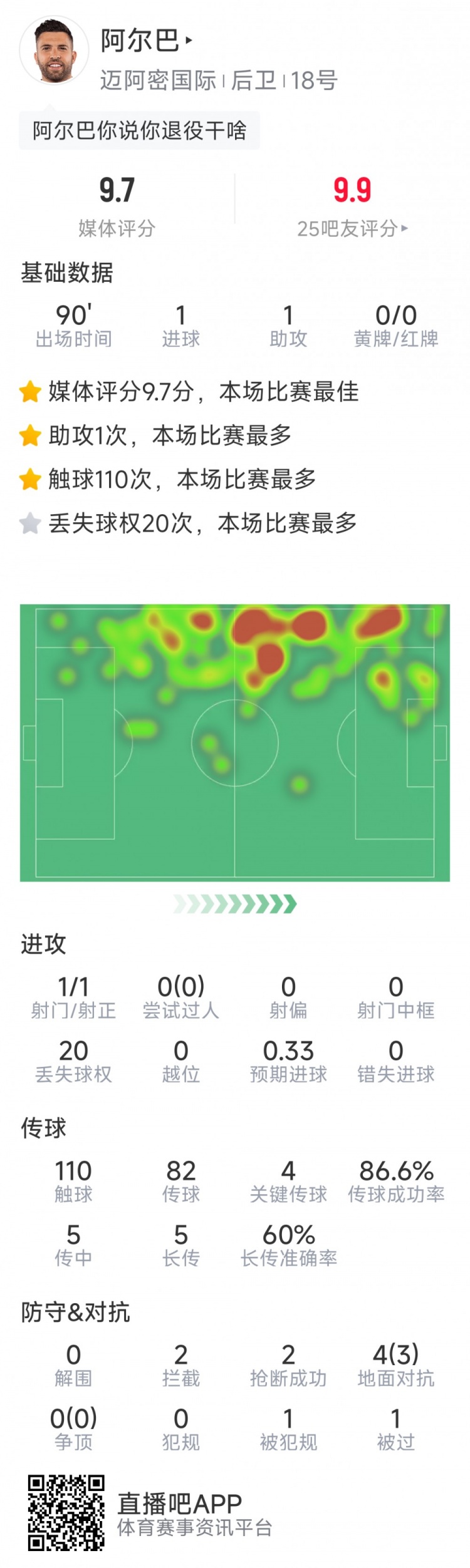 In the MLS make-up game, Inter Miami defeated Atlanta United 4-0. Alba, who had previously announced his retirement at the end of the season, performed well. The following are his statistics in this game: