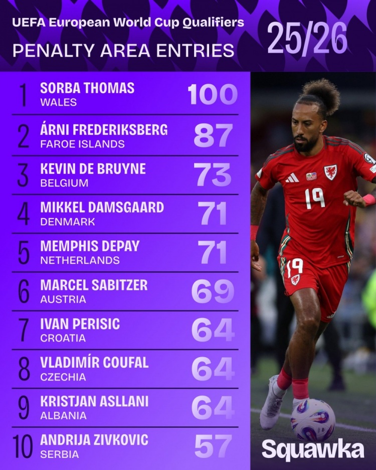 This World European qualifying group stage has come to an end. Squakwa also counted the number of times entering the penalty area in this tournament, with Welsh winger Thorba Thomas leading the way.