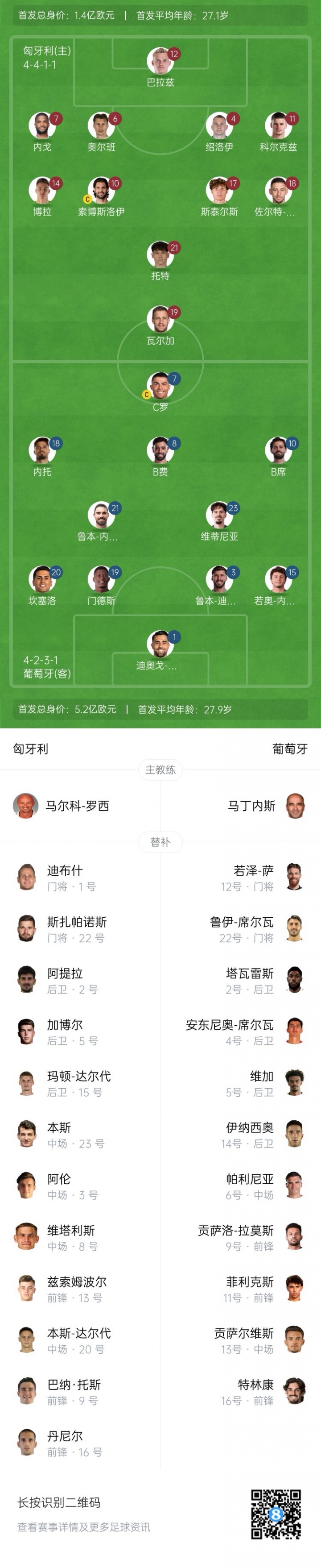 September 10th news World-European Preparation Group F, Hungary's home match against Portugal is about to begin. The starter was released before the game.