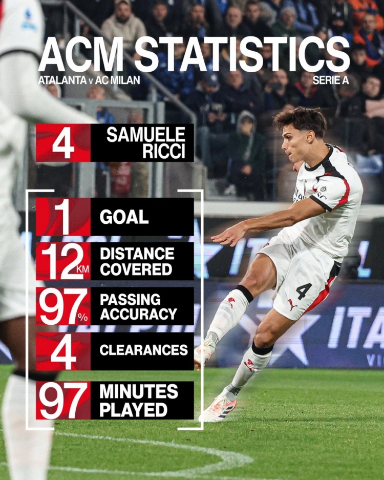 Milan's official social media posted Ricci's statistics for this game. He scored 1 goal in 97 minutes of playing time, ran 12 kilometers, had a passing success rate of 97%, and completed 4 clearances.