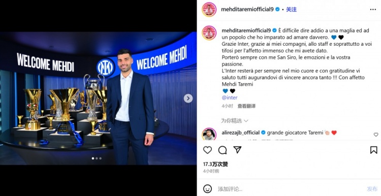 Taremi said goodbye to Inter Milan: especially thanks to Inter Milan fans, and wishes Inter Milan to win more honors in the future