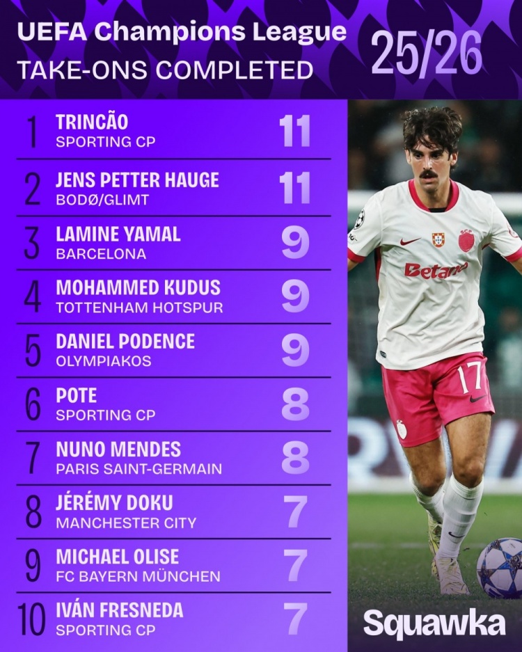 This season s Champions League dribble list: Trincao and Hauge ranked top two 11 times, Yamal third