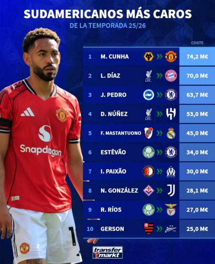This summer window, South American players transfer fee list: Cunya ranked first in Euro 74.2 million, Dias second in the
